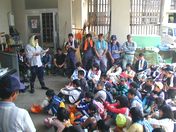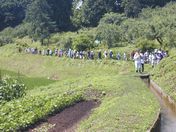 西五百川小学校に集合した参加者(西五百川小4年生親子50人、スタッフ12人)は、まずお米が出来るまでのお話や夏草三中堰の寸劇で学習したあと、案内人の斎藤利八さんを先頭に夏草三中堰巡りがはじまりました。維持管理の難しさや堰水門工事を成し遂げるまでの苦労話しなど、地域用水を守る立場として、体験を話して頂きました。