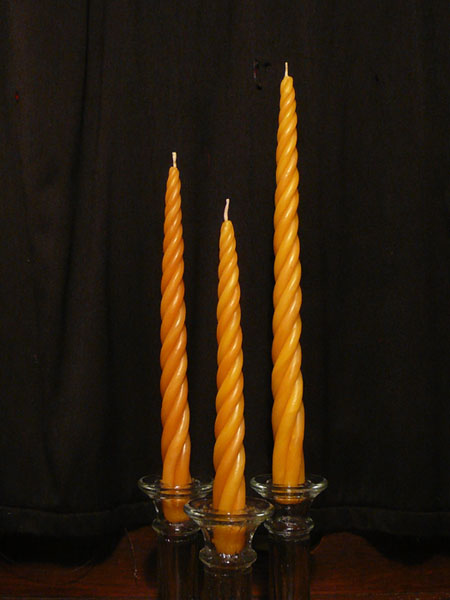 中世欧州の蜜ろうそく職人同様に、4本の棒状に伸ばした蜜ろうに糸をはさめてひねりました。琥珀のような色艶が高級感を醸し出します。アンティークな燭台にぴったりです。 |